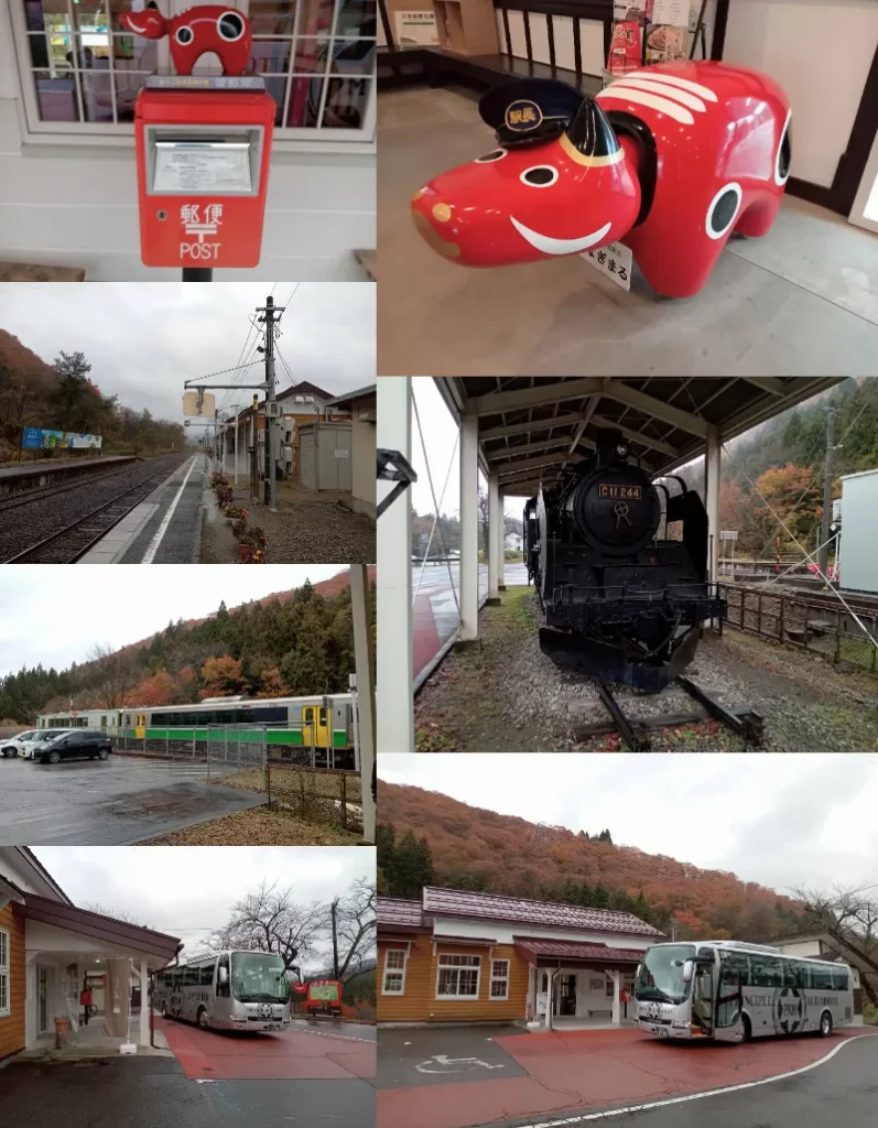 今度はお客様を会津柳津駅にてお客様をお出迎え🚋🚌駅で福島土産の定番かわいい『赤べこ』を発見🥰柳津町は赤べこ伝説発祥の町。いたるところで赤べこの親子が出迎えてくれますよ🐄