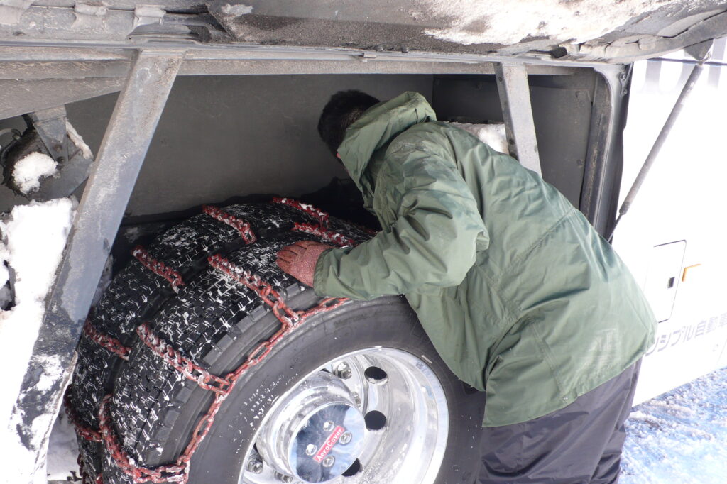 - チェーン着脱研修:悪天候の中でも迅速・確実にチェーンの着脱作業を行う方法を学習